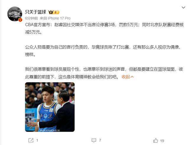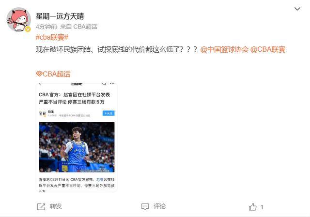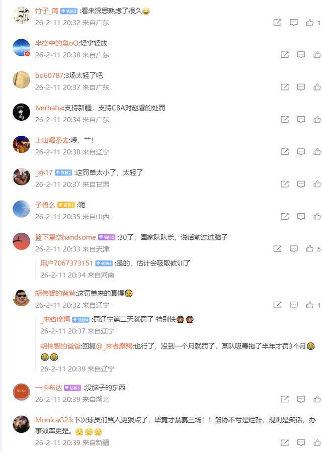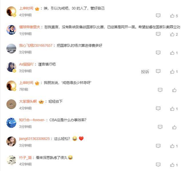 不少的球迷都在评论区表示这个处罚太轻了,轻拿轻放,对国家队的比赛丝毫没有影响,实际上该处罚他不能出战中国男篮的比赛才对。