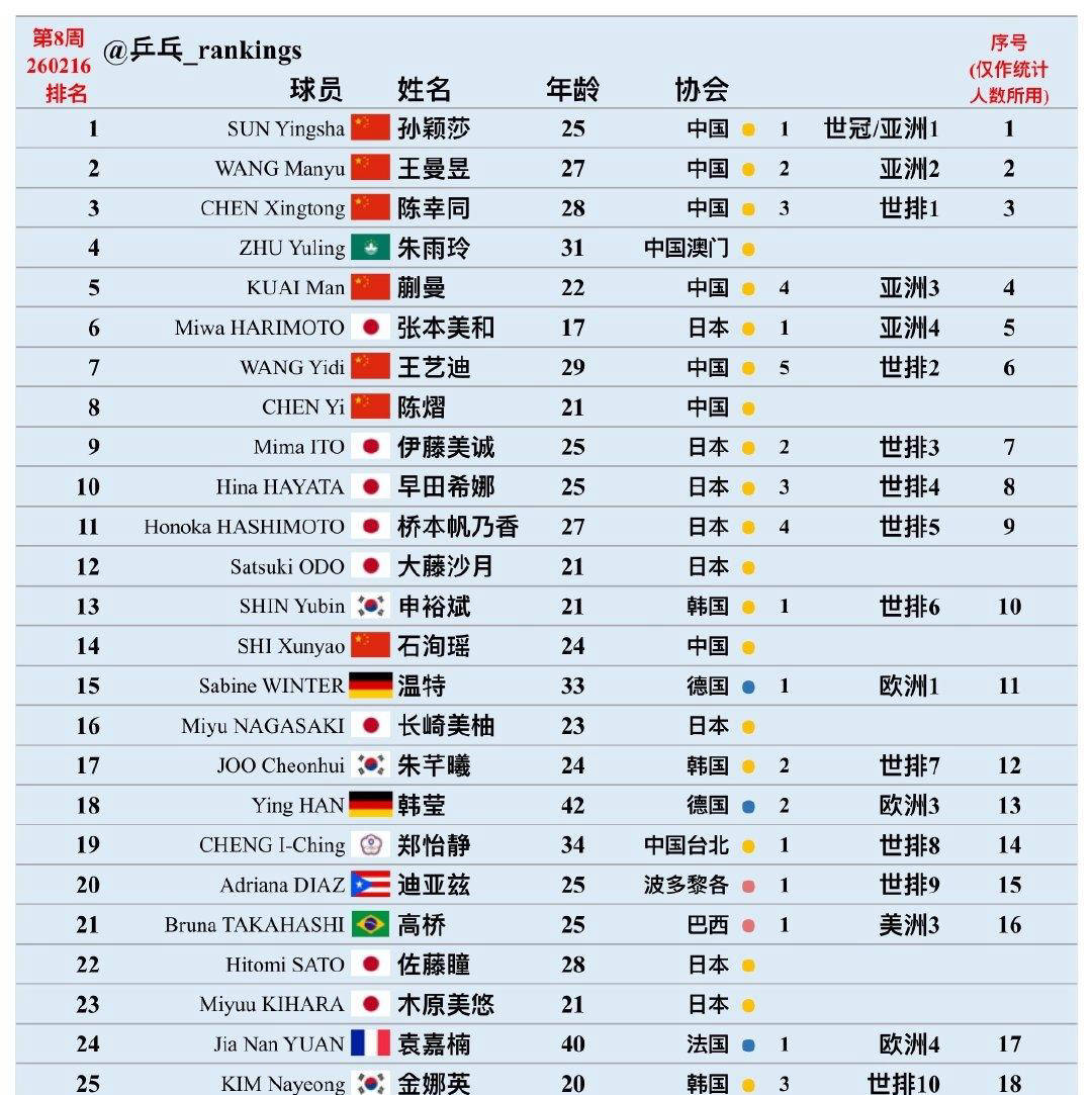 女队方面,本次世界杯顺位也已揭晓。孙颖莎因其在世乒赛和亚洲杯上的冠军头衔,稳居榜首。王曼昱、蒯曼及日本选手张本美和则以亚洲杯四强身份获得参赛资格。陈幸同、王艺迪、日本的伊藤美诚、早田希娜、桥本帆乃香以及申裕斌,均是凭借世界排名入围。此外,德国选手温特在欧洲16强杯夺冠赢得世界杯名额,韩莹、袁嘉楠和匈牙利的斯佐科斯同样因打进欧洲16强杯前三强获得参与资格。非洲冠军高达与世青赛冠军覃予萱,大洋洲强者池旼亨、李春丽也成功进入名单。其他大部分选手则是依托世界排名拿到资格。