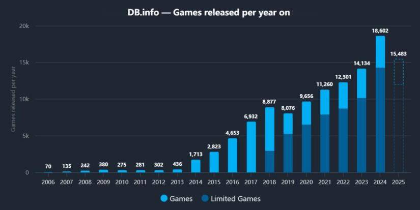 SteamDB的数据显示,2025年发布的1.3万款新游戏中,有40%的游戏收入不足100美元,连上架成本都无法收回,收入突破10万美元大关的仅约1000款。