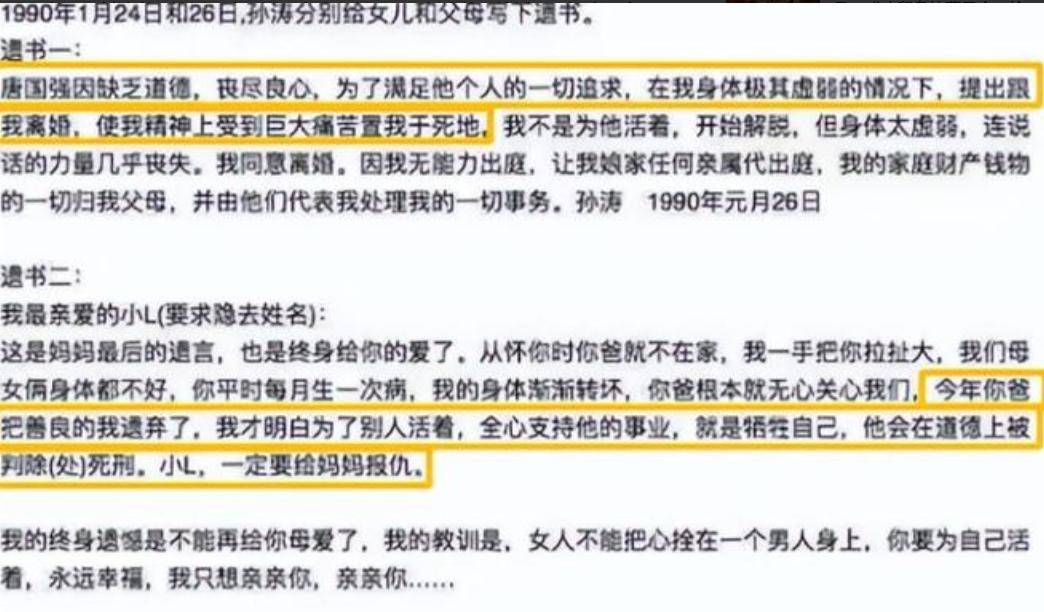 所有争议始终绕不开1990年除夕夜的那根绳子。唐国强的前妻孙涛在父母家中自缢身亡,遗书中痛斥唐国强“冷血忘恩”,并嘱咐7岁的女儿“给妈妈报仇”。当时,唐国强正与现任妻子壮丽传绯闻,被指控停用银行卡、断家用逼迫离婚。舆论风暴几乎吞噬了这个凭借《三国演义》走红的演员,单位停戏,记者堵门,他只能抱着女儿躲进招待所,连灯都不敢开。更戏剧化的是,孙涛去世不到三年,唐国强便与壮丽结婚,而亲生女儿唐莉在成年后公开指责生母“心胸狭隘”,力挺继母。